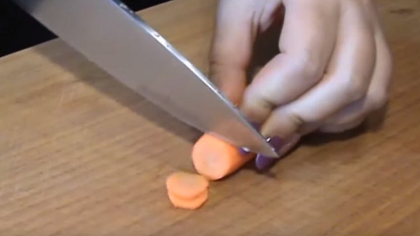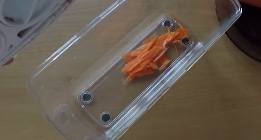 Витягти суцвіття за допомогою шумівки. Провести подрібнення морквини на тертці для корейських овочів.![]()