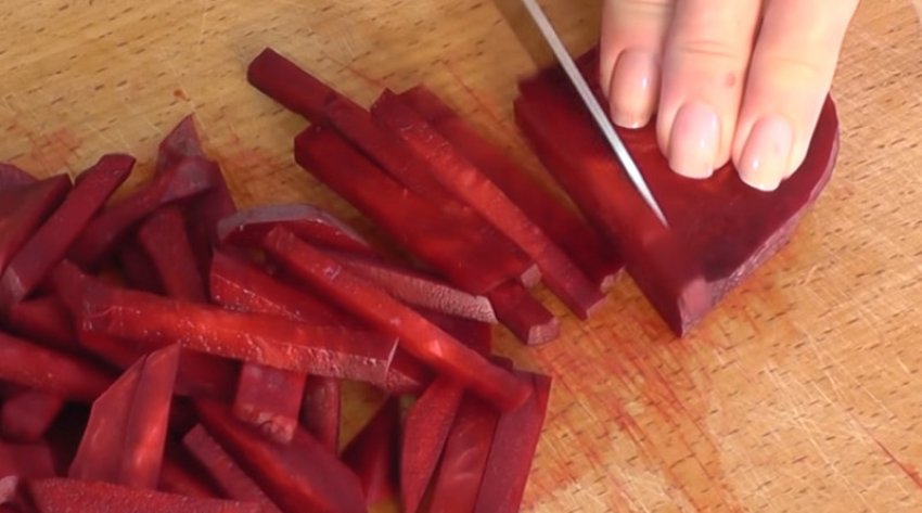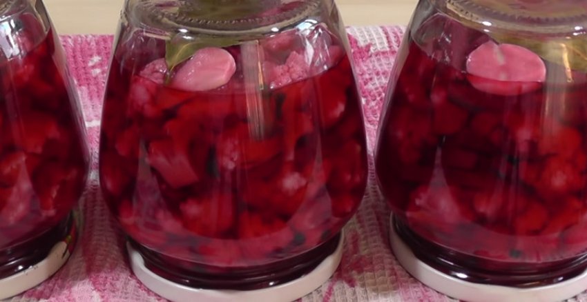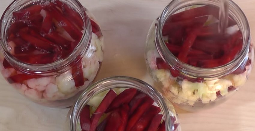 У банку покласти 1 бутон гвоздики, 1 лав. лист, 2 горош. душ. перцю, 4 горош. чорного перцю, 1 зуб. часнику, 1 ч. л. солі, 1 ч. л. цукру, шарами буряк і капусту.![]()