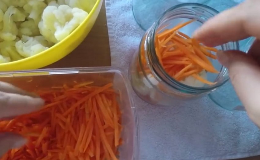 Зверху щільно викласти суцвіття, пересипаючи їх морквою. Додати прянощі з розрахунку 3 горошини запашного, 5 горошин чорного перцю на ємність 0,5 л.![]()