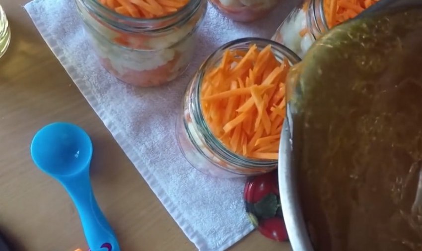 Зняти з печі, додати олію та оцет. Укласти в банки шарами морквину і суцвіття.![]()