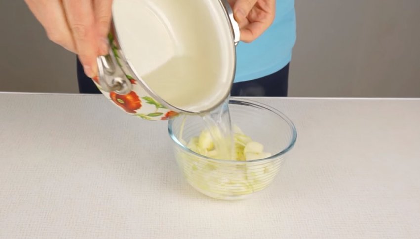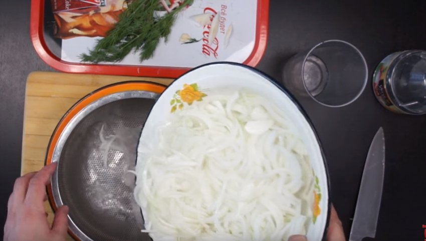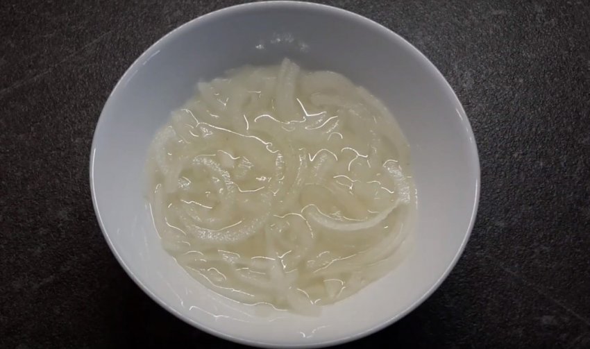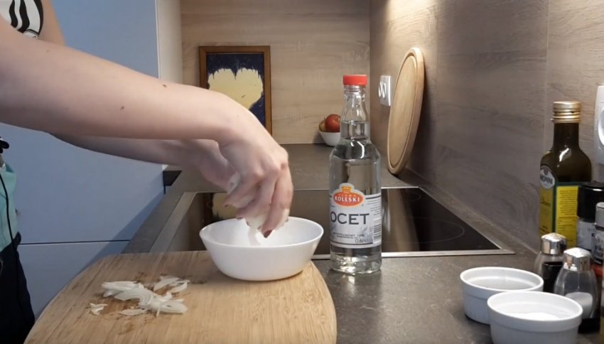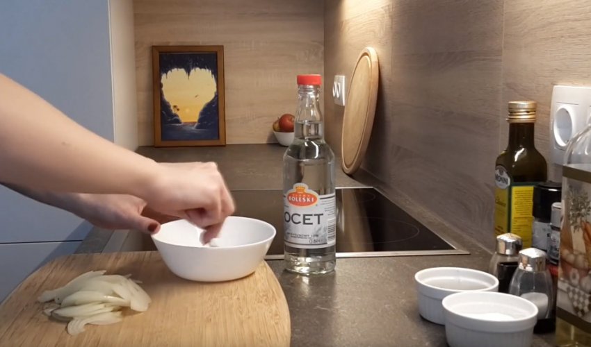 У ємність із цибулею влити оцет і воду, залишивши на 10 хвилин настоюватися.![]()