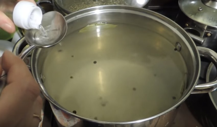 Воду в каструлі нагріти до кипіння. Кинути горошини перцю, цукор і сіль. Вимкнути після закипання, ввести лавровий лист і оцет.![]()