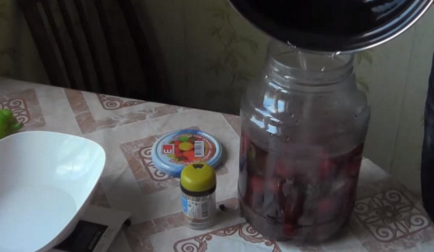 Запашний перець додають у банку зі сливами. Сироп заливають у ємність із горілкою і сливами, перемішують.![]()