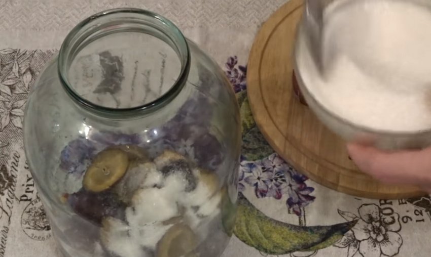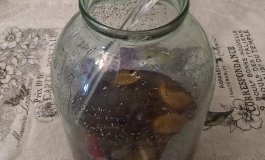 Банку накрити тканиною і залишити на добу для утворення сиропу. Ємність потрібно періодично струшувати, щоб сироп змочував шари слив.![]()
