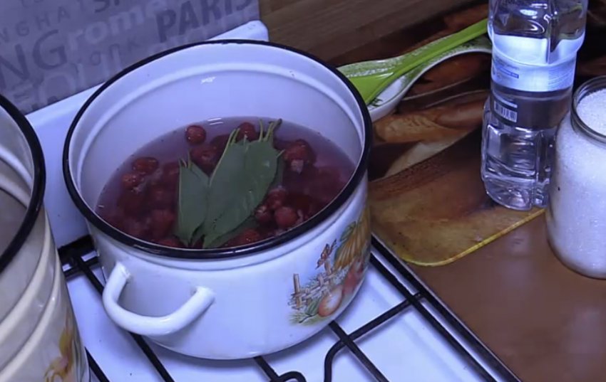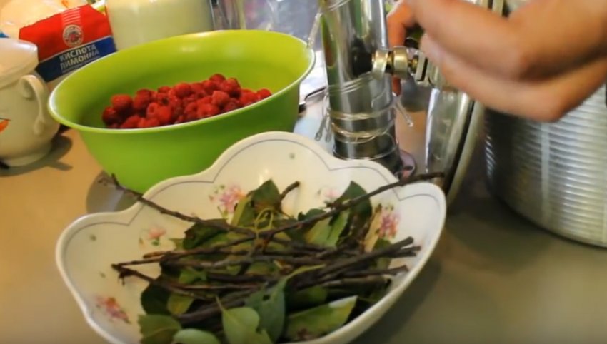 Закип'ятіть воду. Додайте в неї плоди малини та вишневе листя.![]()