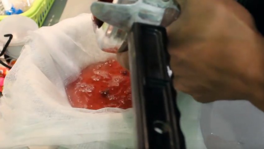 - Злийте спиртовий наповнювач і ретельно відіжміть у нього ягідну масу через п'ятишарову марлю.