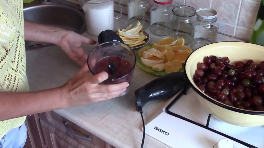 Подрібніть промиті плоди аґрусу за допомогою м'ясорубки.![]()
