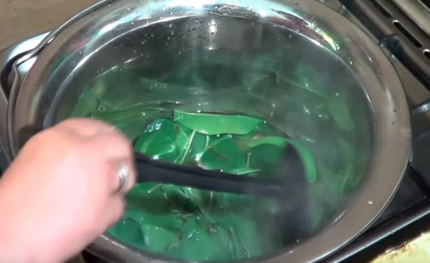 Скласти вишневе листя в широкий сотейник або металеву миску, додати до нього воду. Поставити ємність на плиту, дочекатися закипання води.![]()