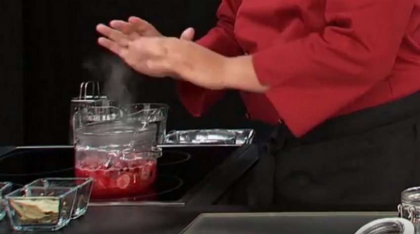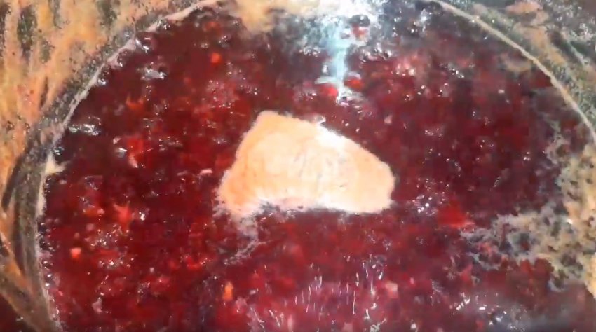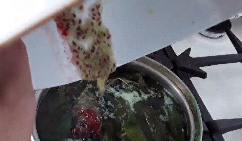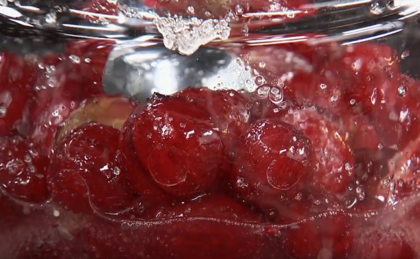 - Перевантажити в киплячий сироп ягоди й одразу зняти з вогню. Дати варенню вистоятися протягом 12 годин, причому час після повного охолодження ємність має провести в холодильнику. Накривати каструлю не можна, щоб на кришці не утворювався конденсат, який капатиме у варення. Однак, щоб уникнути потрапляння в продукт мошок, бруду або інших сторонніх домішок, поверхню слід прикрити шаром марлі або листом пергаменту для випічки.