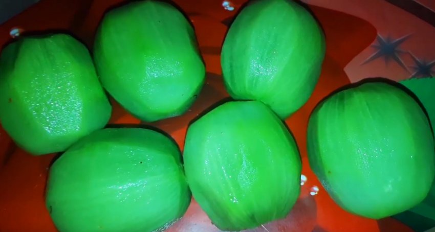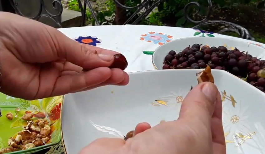 Великі плоди зробити порожніми всередині: за допомогою англійської шпильки або голки витягти з кожної ягоди частину м'якоті, намагаючись зберегти форму аґрусу.![]()