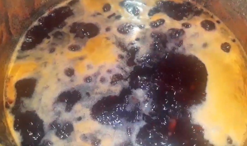 При постійному помішуванні довести варення до кипіння. Під час помішування особливу увагу слід приділяти нижній частині джему, оскільки вона може прилипати до дна і підгорати. Піну, що час від часу утворюється на поверхні маси, важливо знімати.![]()