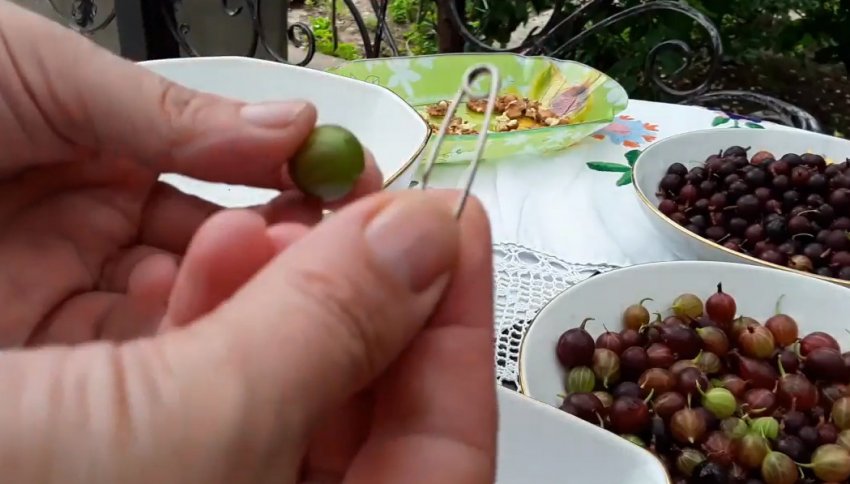 - Проколоти кожну ягоду голкою. Цей простий секрет дасть змогу зберегти цілісність аґрусу, а отже, забезпечить правильну структуру та смак готової страви: під час контакту з окропом гаряча вода частково проникне в середину плоду, температура всередині та зовні ягоди швидко зрівняється, і шкірка не лусне.