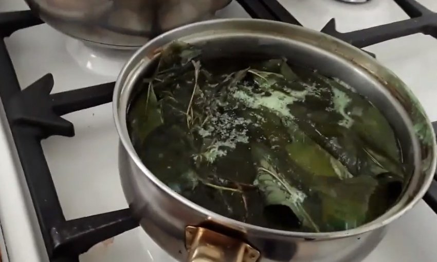 У воду додати листя вишні, чебрець і материнку, поставити на вогонь, довести до кипіння.![]()
