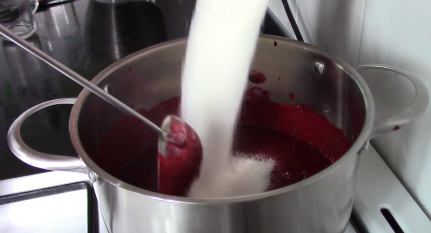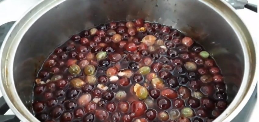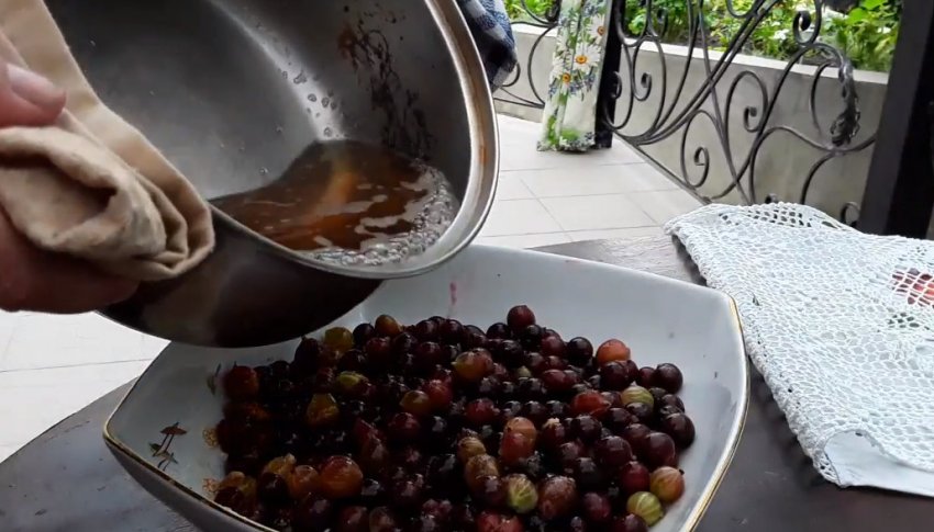 Додати в рідину витягнуту з аґрусу м'якоть із соком, дати трохи прокипіти, потім зняти з вогню і процідити. Відразу ж засипати цукровий пісок і добре перемішати, поки цукор не розчиниться. Знову поставити на вогонь і довести до кипіння.![]()