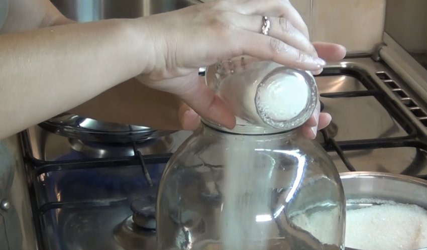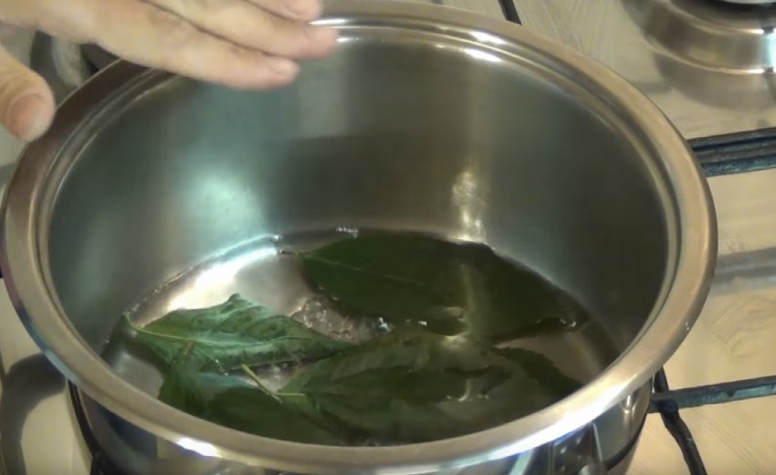 Після 4-5 хвилин кипіння малої інтенсивності, листя видалити, засипати цукор і сіль. У рідину долити трохи води (замість тієї, яка випарувалася), помістити на плиту, закип'ятити.![]()