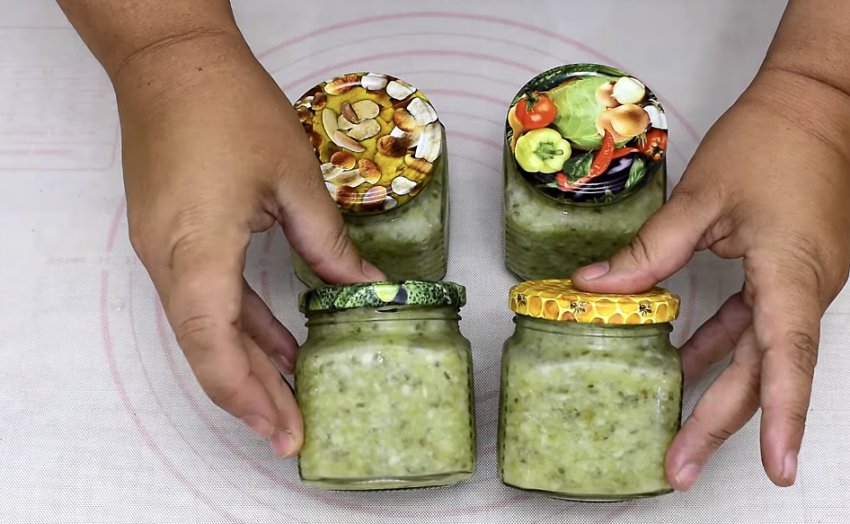 Готову закуску покласти в простерилізовані банки, закрити прокип'яченими кришками.![]()