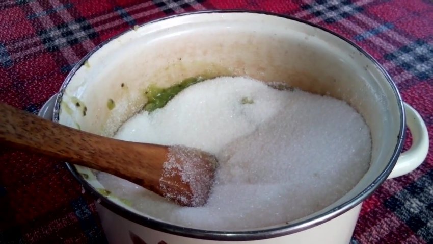 - Через зазначений проміжок часу каструлю ставлять на середній вогонь. Після закипання температуру відразу ж знижують до мінімуму. Ви можете помітити, що яскраво-зелений колір варення починає набувати жовтуватого відтінку. У процесі варіння обов'язково потрібно знімати піну, що утворюється, - вона для варення не годиться. Масу проварюють близько 10 хвилин, поки не перестане виділятися піна.