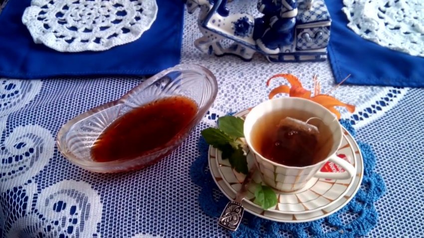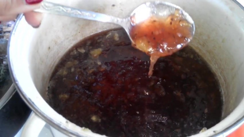 - Вимкнувши газ, варенню дають постояти 4-5 годин, після чого його знову відправляють на вогонь. Дочекавшись повторного закипання, полум'я зменшують до мінімуму й активно знімають піну з поверхні киплячої солодощі. Варити потрібно до того моменту, коли перестане утворюватися піна. Готове варення набуває темного забарвлення. За своїм кольором і консистенцією маса нагадує гречаний мед.