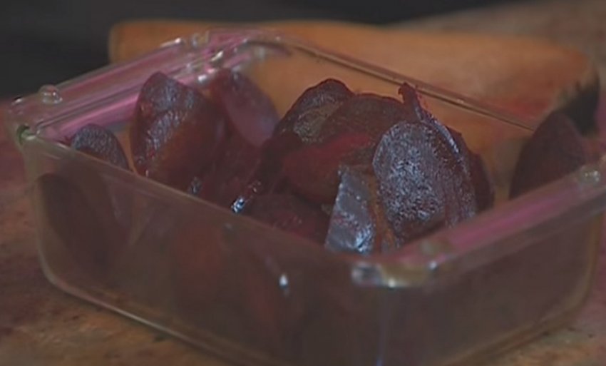 Варений буряк очищають і нарізають тонкими кружечками.![]()