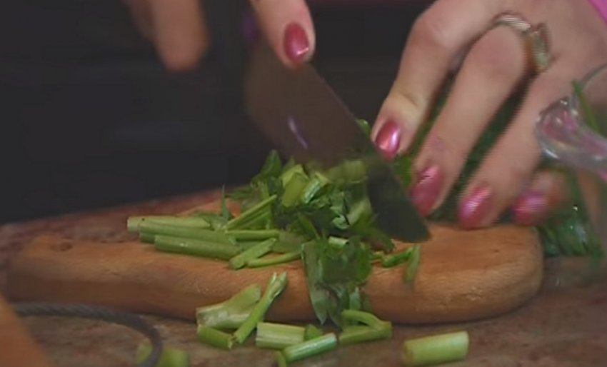 Зелень селери дрібно нарізається, часник очищається і додається до капусти шматочками.![]()
