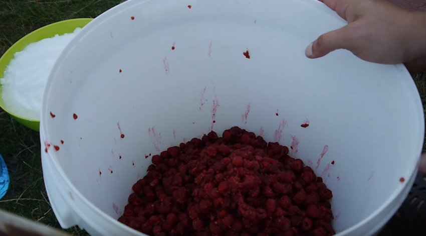 - Додати до плодів 500 г цукру, не перемішуючи його з малиною. Ємність має бути наповнена інгредієнтами приблизно на 2⁄3 глибини, тому що в процесі бродіння ягідна маса збільшуватиметься в об'ємі.