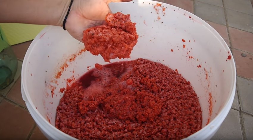 Поставити ємність із ягідною масою в тепле місце на 4-5 днів, щоб рідина активно бродила. У процесі бродіння ретельно перемішувати суміш по 3-4 рази на день, щоб вона не вкривалася цвіллю.![]()