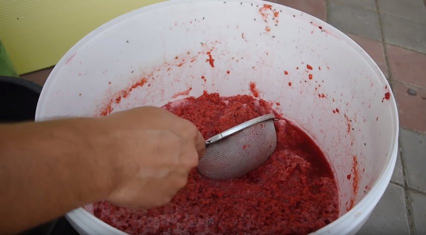 Процідити масу, що перебродила, через сито, щоб відокремити від неї ягідну макуху. Отриману рідину залити в чисті скляні ємності, наповнюючи їх на 2⁄3 об'єму.![]()