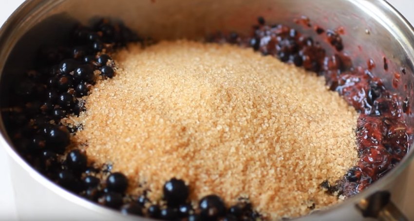 - В подготовленную кастрюлю выкладывают ягодную массу и всыпают сахар.