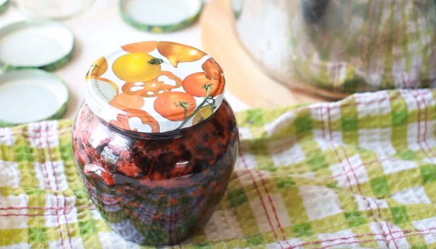 Закупорюють кришками. Ставлять на кришки, щоб перевірити якість закупорювання. Накривають пледом до повного охолодження. Зберігають за кімнатної температури.![]()