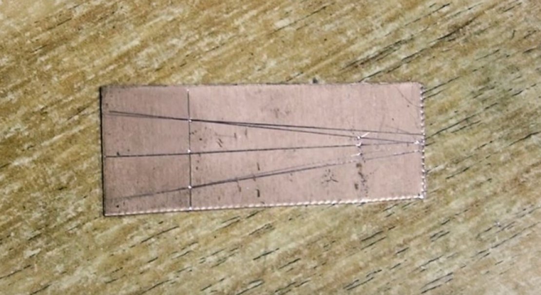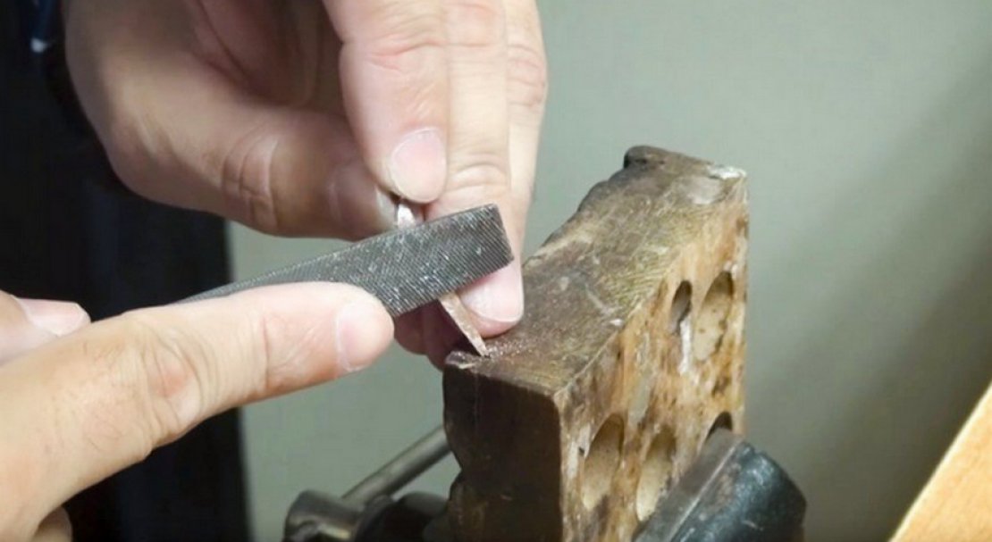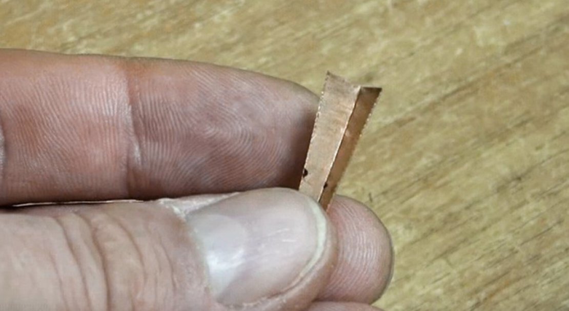 За заготовленим шаблоном на металевому листі вирізається бічна площина. Це буде основою. Напилком згладжуються задирки, підрівнюються краї. Далі поверхня обробляється наждачним матеріалом, щоб поліпшити зчеплення з припоєм.