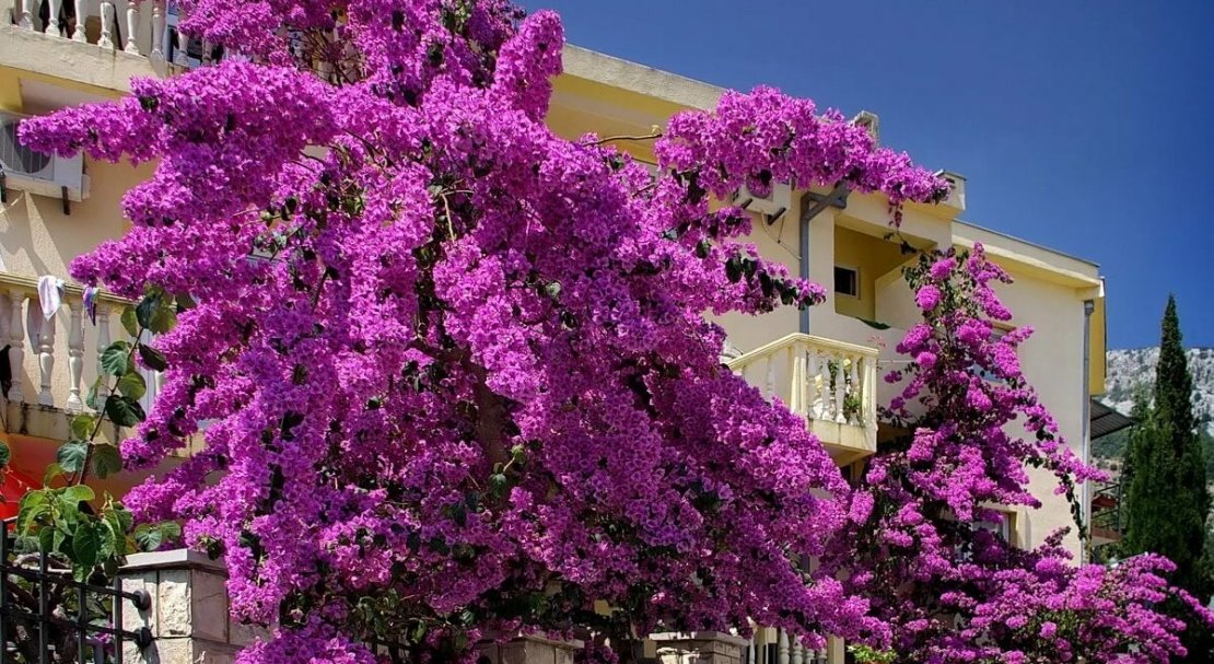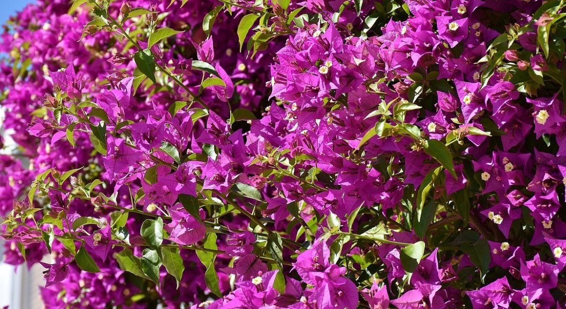 Бугенвілія належить до родини весняних первоцвітів і приносить сюрприз: те, що більшість людей вважають яскравими кольоровими квітами, усе-таки не квіти, а яскраві листки, які приховують непомітні квіточки. Щоб широко розрослося, потрібно спекотне і сонячне літо.