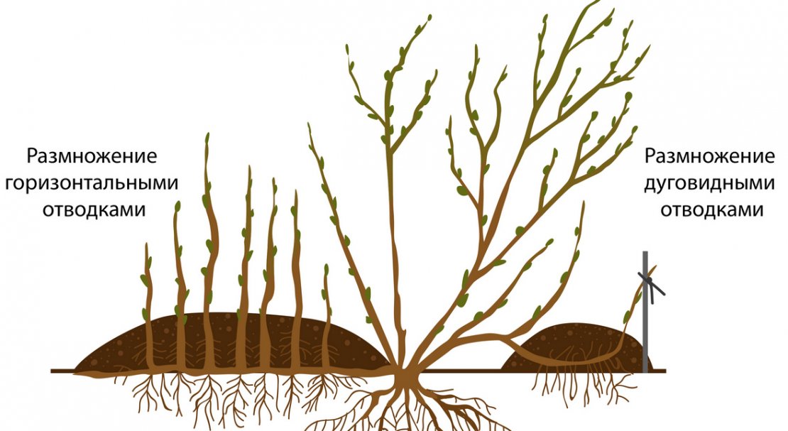 - Горизонтальними відводками. Час — осінь. Найпростіший метод розмноження, який передбачає закопування лежачих стебел землею. Після вкорінення і появи бруньок, саджанець можна відокремлювати від материнського куща і висаджувати на постійне місце.