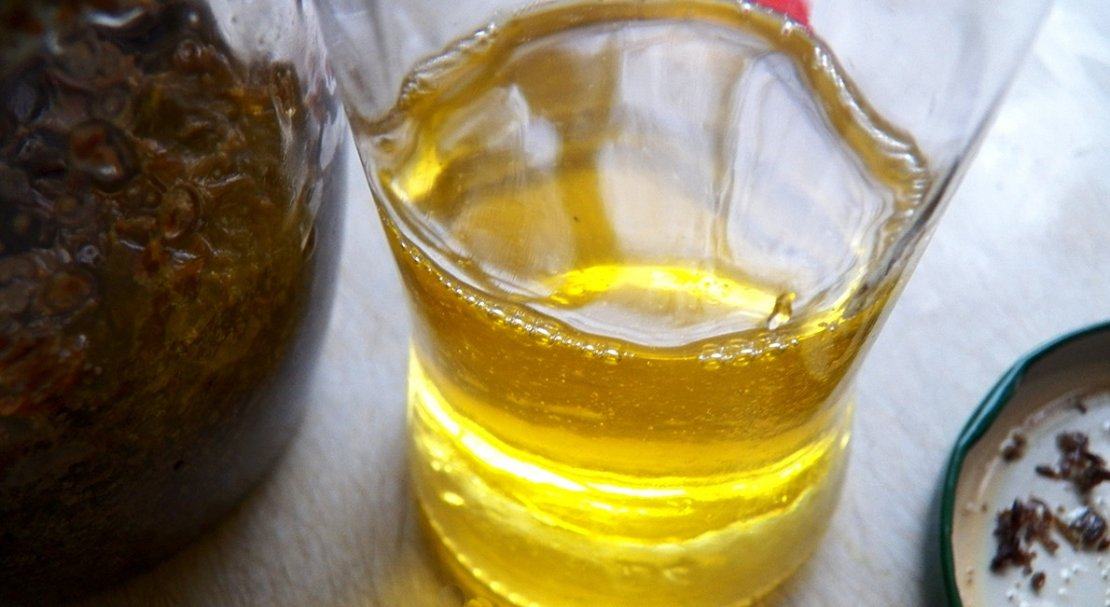 - Отриману після віджимання мезгу поміщають в емальований посуд, заливають соняшниковою олією і ставлять в духовку на 1-1,5 години.