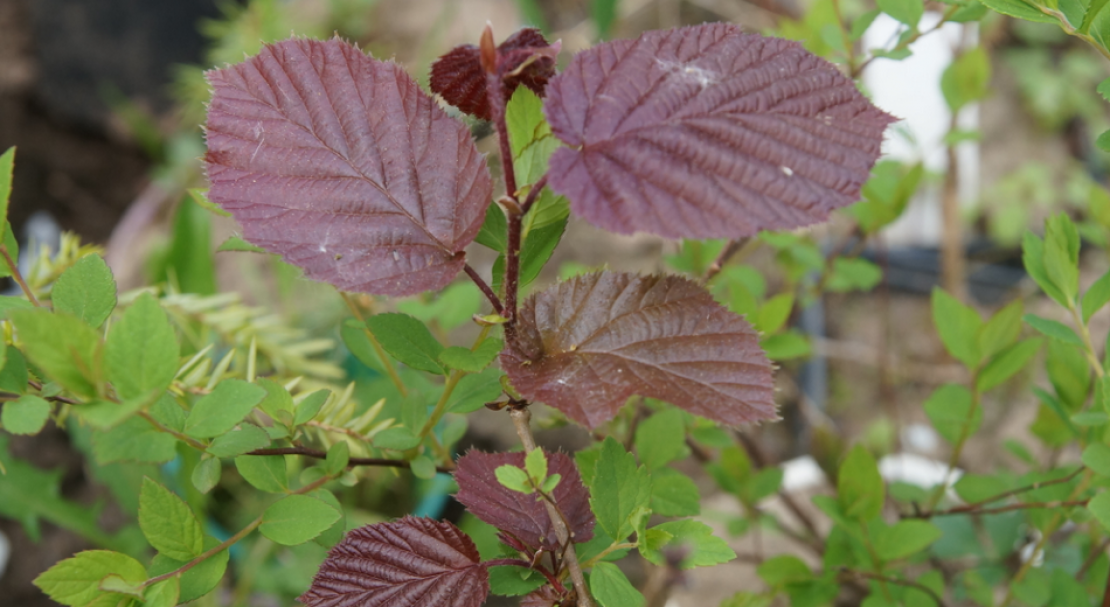 Гілки вкриті слаботрещиноватой сіро-коричневою корою. Листя бордові, по жилах є опушення, розпускаються після середини квітня. До липня листові пластини набувають зелене забарвлення. У вересні листя злегка буріє. Довжина листа — 10-12 див.