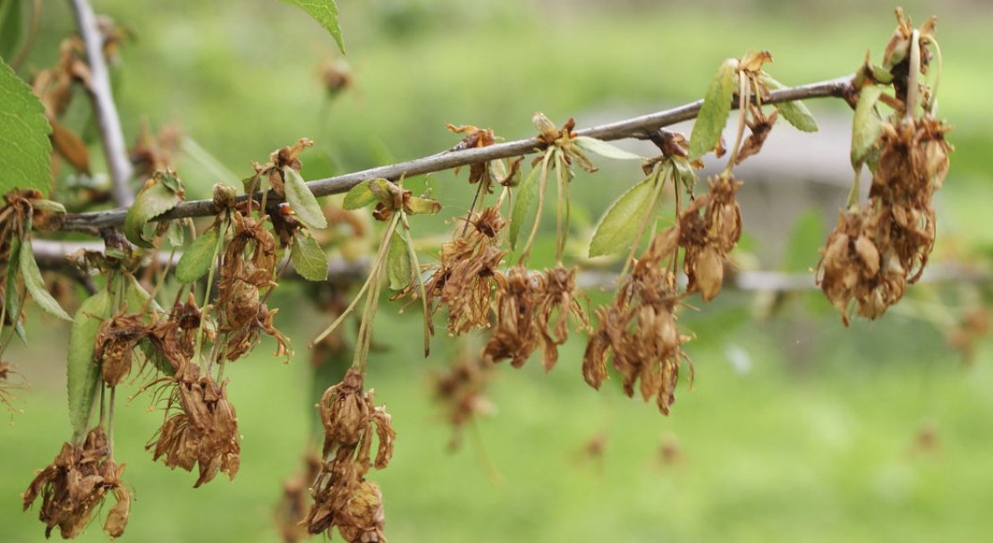 | Моніліальний опік | Уражені гілки необхідно обрізати, а місця зрізів відразу ж потрібно змастити садовим варом. Далі рослини обробляють препаратом «Скор». Для цього необхідно приготувати розчин з розрахунку 3 г на відро води. Для лікування необхідні дві обробки: до цвітіння і через 1,5 тижні. |