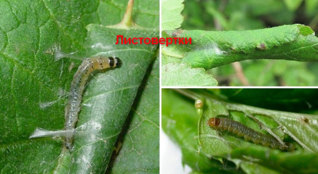 - Листовійки теж шкодять саду. Вони пошкоджують бруньки і зав'язі. У процесі росту личинки заляльковуються, викликаючи згортання листя. При появі ознак зараження, обприскуйте кущі «Актеллік» або «Элесаром».