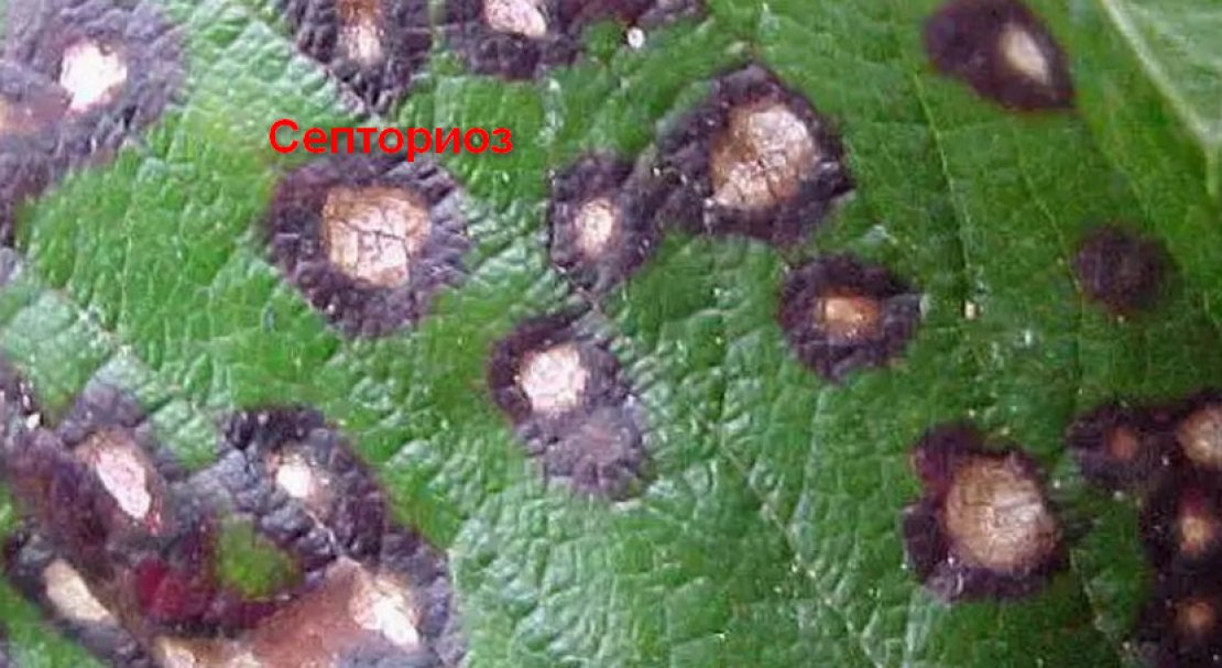 - Біла плямистість (септоріоз) з'являється навесні і викликає масове всихання листя. Спочатку на листках виникають невеликі червонуваті плями, які потім стають світлими з темною облямівкою по краю. Активується гриб в дощову погоду. Лікується обприскуванням препаратами на основі міді.