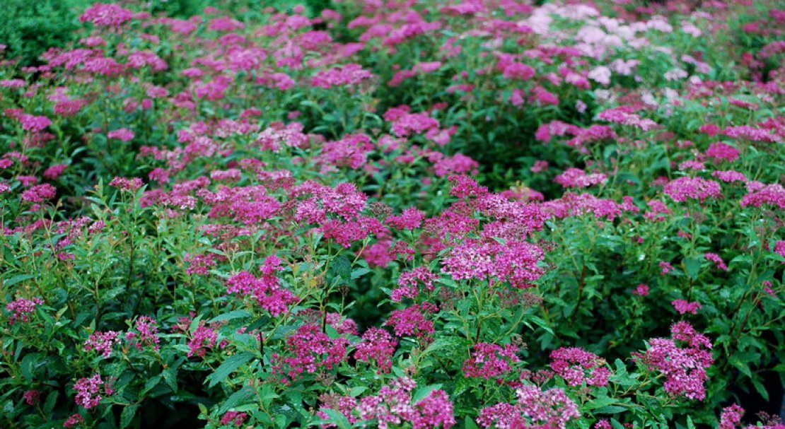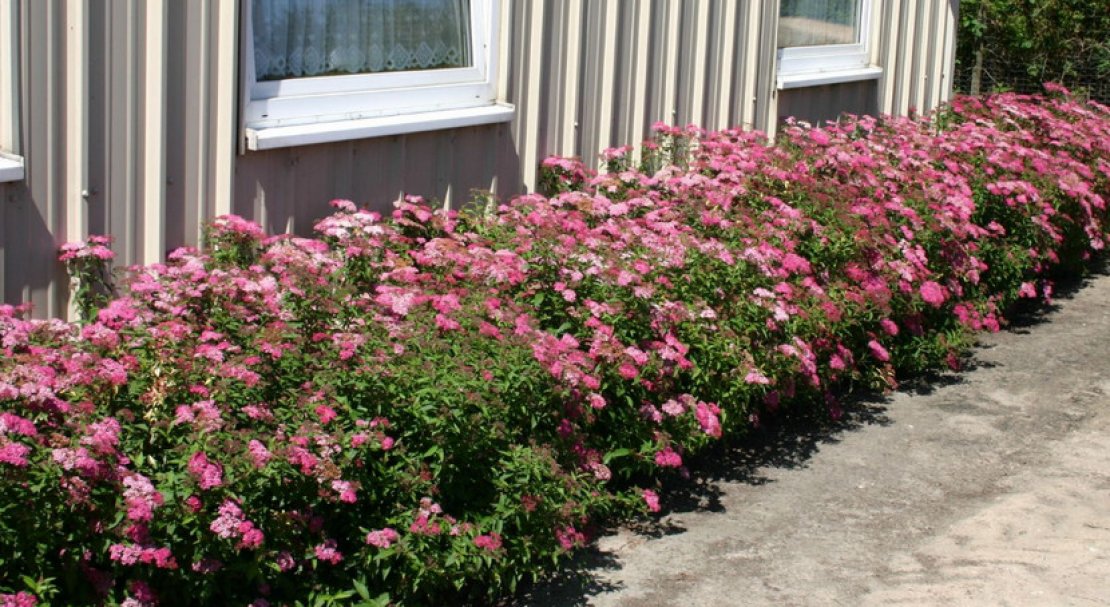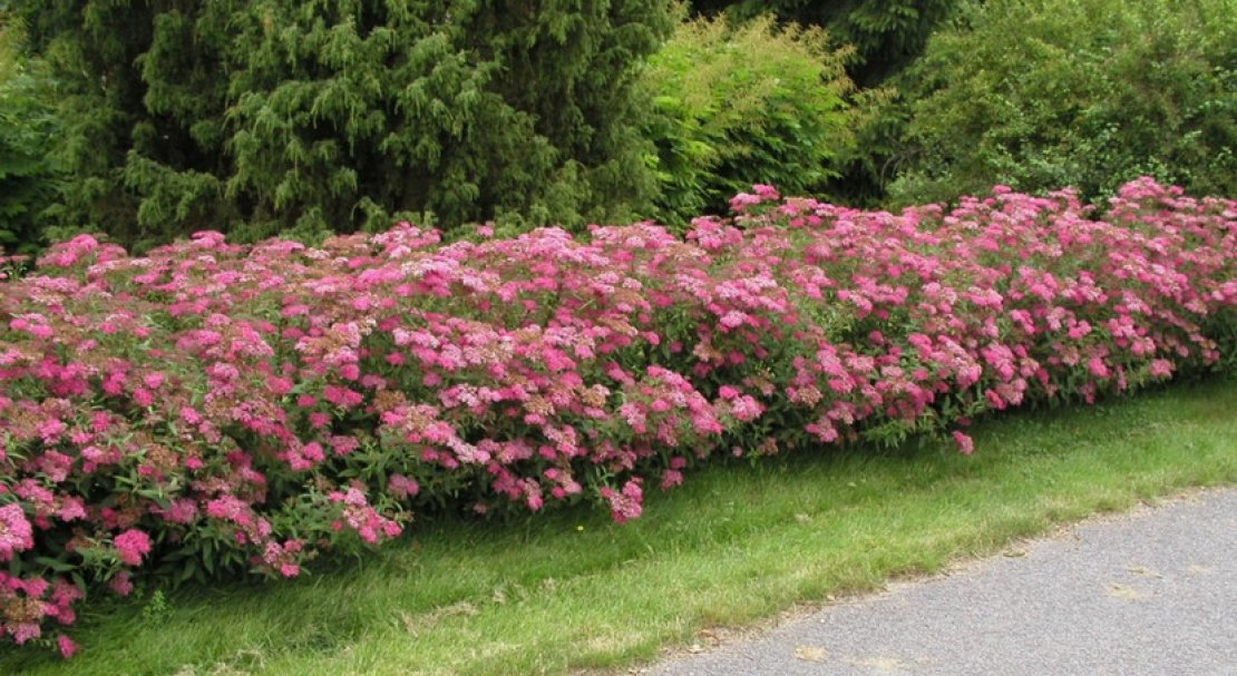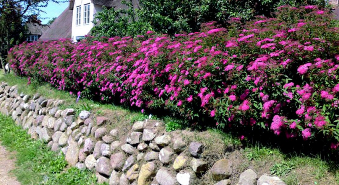 - Кожен вид спіреї висаджується своїм способом. Наприклад, літньоцвітучі рослини часто використовуються як живий паркан. У цьому випадку кущі садять на відстані 0,5 м один від одного (міжряддя повинні бути не менше 0,4 м). Групові висадки вимагають збільшення відстані між рослинами до 0,7-1 м.