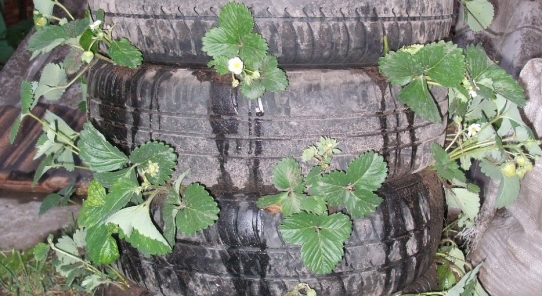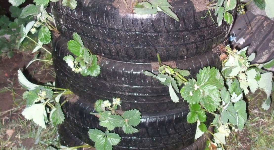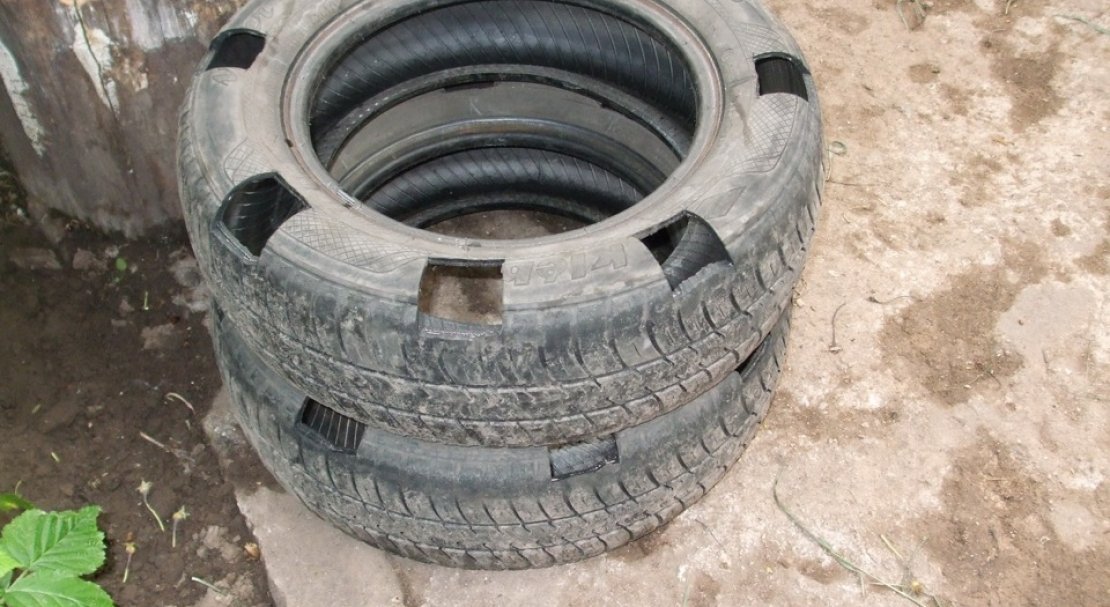 - Якщо для виготовлення конструкції використовуються шини різних розмірів, то їх верхні частини потрібно зрізати. При використанні автомобільних шин однакового діаметру в їх бічної частини вирізають лунки для полуничних саджанців.