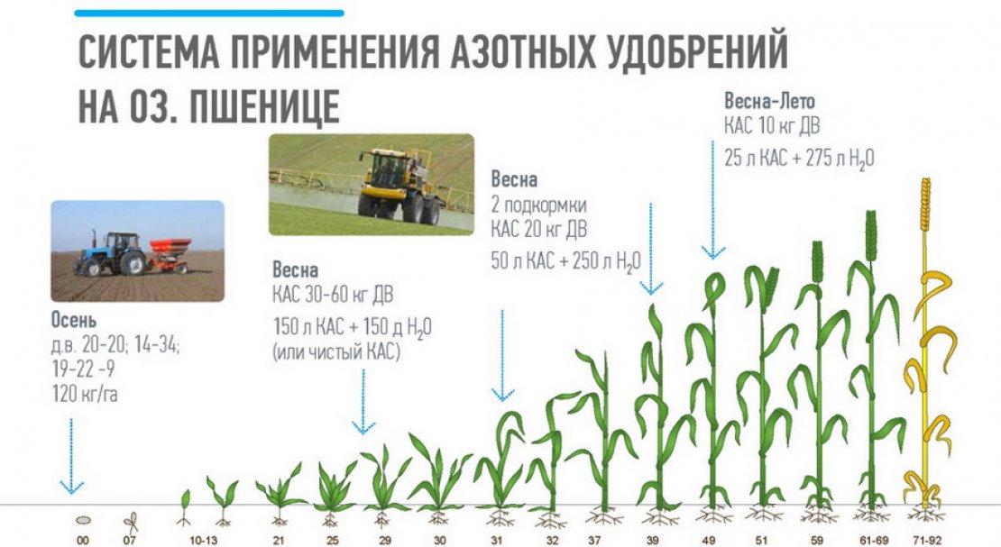 Ріст і продуктивність злаків багато в чому залежать від складу ґрунту та наявності в ньому поживних речовин. Протягом усього періоду вегетації пшениця потребує як мінеральних, так і органічних добрив. Перед посівом у ґрунт необхідно внести аміачну селітру, виходячи з норми 30 кг/га. Наступного разу азот знадобиться рослині, коли почнеться фаза кущіння. Тоді норма становить 35-40 кг/га. Під час утворення трубки вноситься наступна доза азоту: 60-75 кг/га.