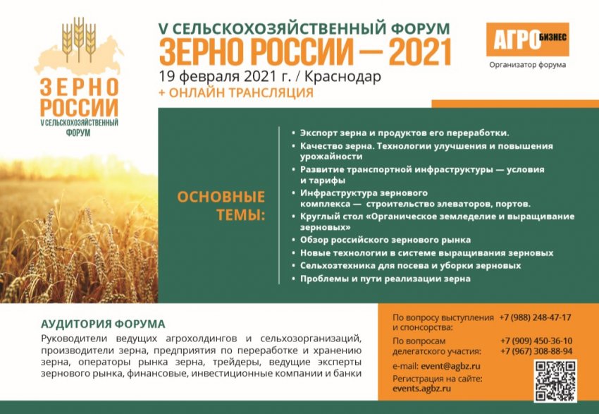 19 лютого 2021 року в Краснодарі відбудеться V сільськогосподарський Форум «Зерно Росії - 2021» - галузева подія, присвячена розвитку і проблемам зернового ринку країни. Форум буде відбуватися як у онлайн, так і офлайн форматі.